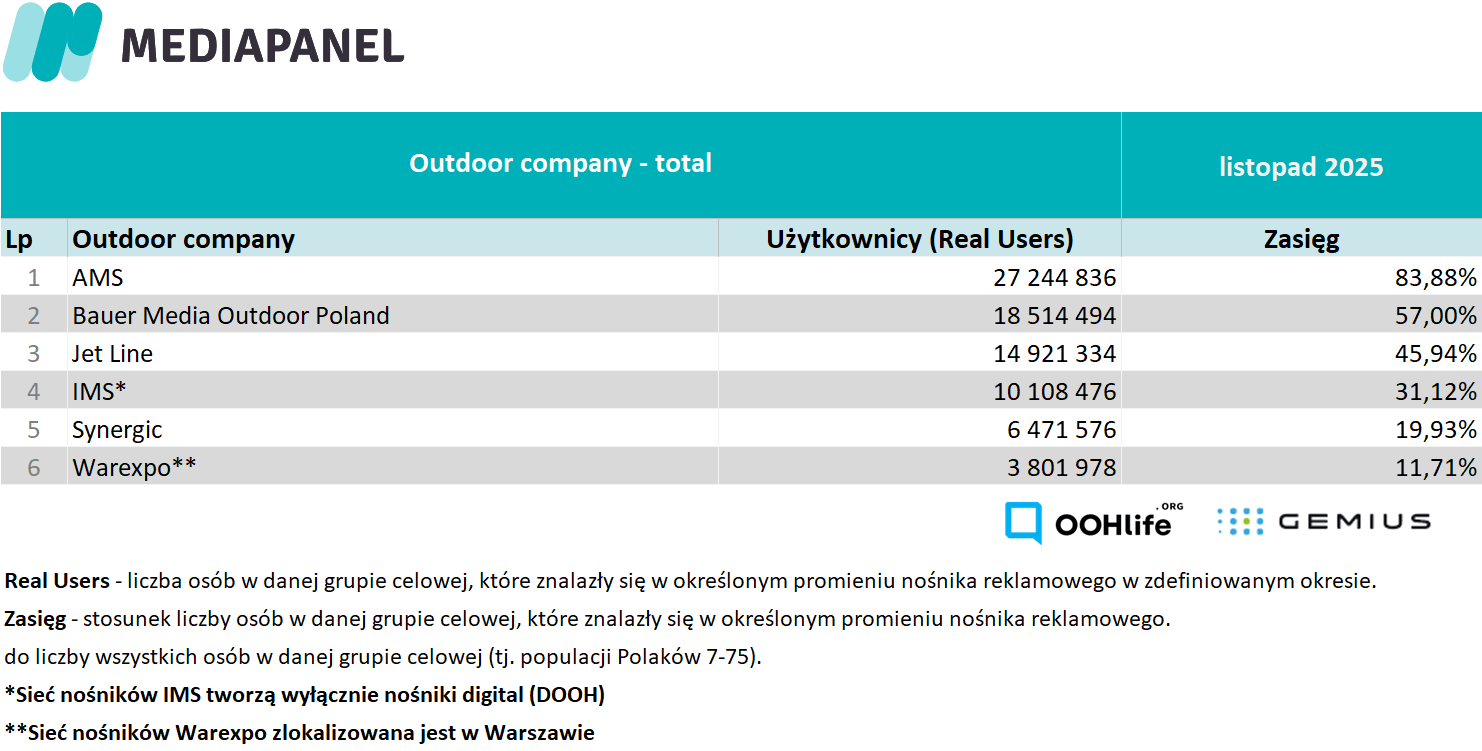 W listopadzie zasięg reklamy zewnętrznej wyniósł 89,3% (zasięg All, w populacji Polaków 7-75), z czego tradycyjnych nośników OOH (outdoor traditional) – 73,9%, natomiast cyfrowych (outdoor digital) – 83,2%. Liczba realnych użytkowników reklamy zewnętrznej wyniosła 29 mln, w tym 14,6 mln mężczyzn i 14,4 mln – kobiet.