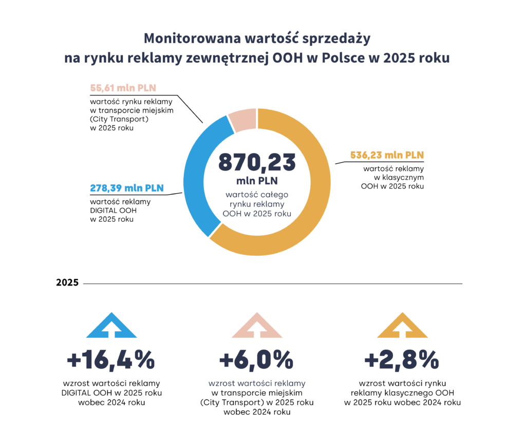 Rynek reklamy zewnętrznej, który w 2025 roku wzrósł o 7% rok do roku do 870,23 mln zł, pozostaje jednym z najbardziej stabilnych segmentów rynku mediowego, jednocześnie dynamicznie się zmieniając.