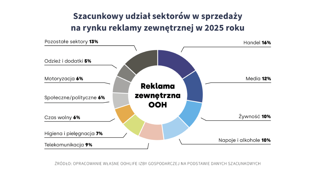 OOH jest medium wykorzystywanym przez szerokie spektrum branż – od handlu i FMCG po sektor usługowy. W 2025 roku największy udział w wydatkach w klasycznym OOH miał sektor handlu (16%), a istotną aktywność wykazywały także media, żywność oraz napoje i alkohole.